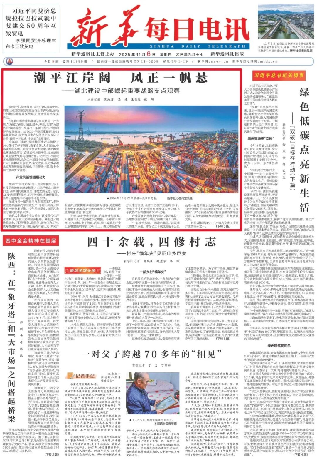 11月6日,《新华每日电讯》头版头条刊发文章《潮平江岸阔 风正一帆悬——湖北建设中部崛起重要战略支点观察》。